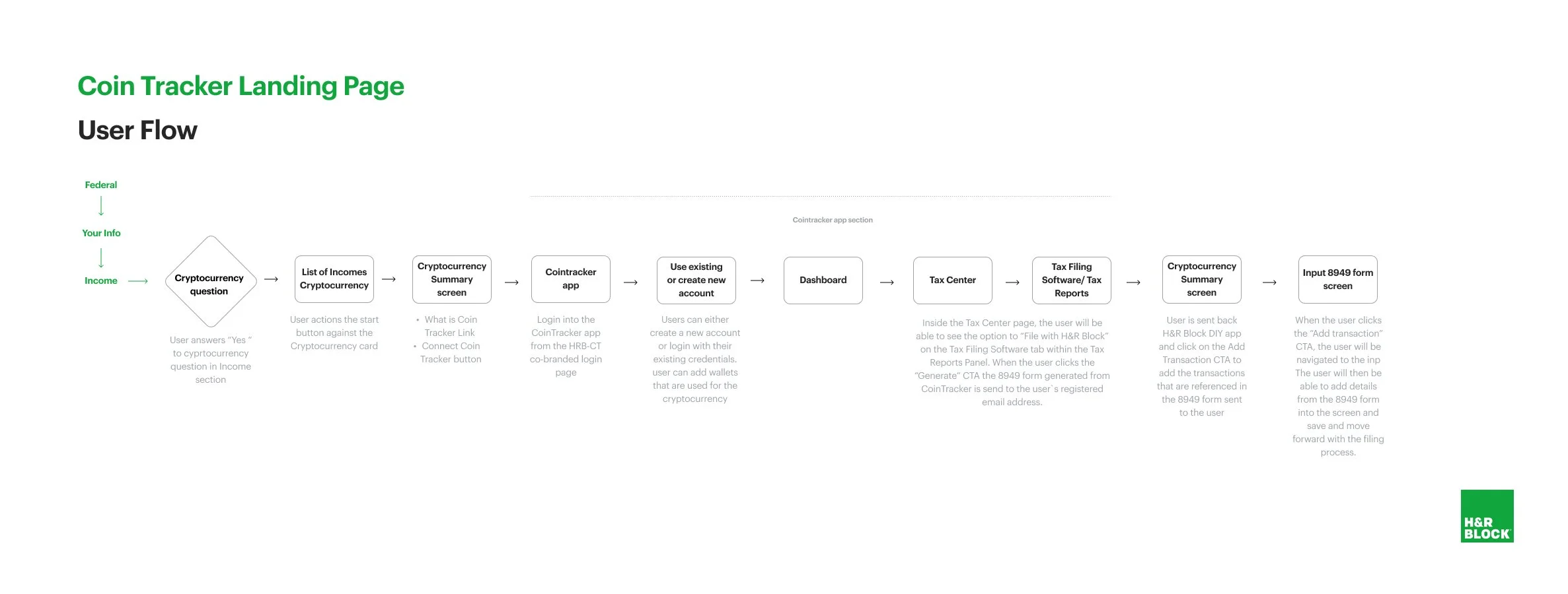 In the first phase of the H&R Block-CoinTracker partnership, we developed a solution to consolidate users' crypto portfolios into the 8949 form. This was the immediate problem that needed to be solved for the current tax season. As a contract employee, I was unable to participate in the test study for this feature, but the product manager and stakeholders agreed that the solution we created was successful.