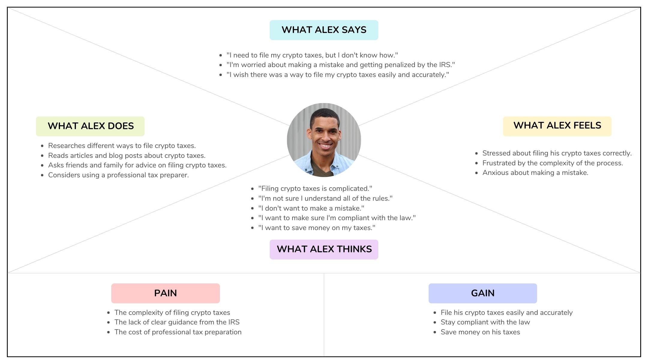 User Interview: The user interviews were conducted with 10 users who had filed crypto taxes in the past year. The interviews were semi-structured and allowed us to delve deeper into the users' experiences and pain points.